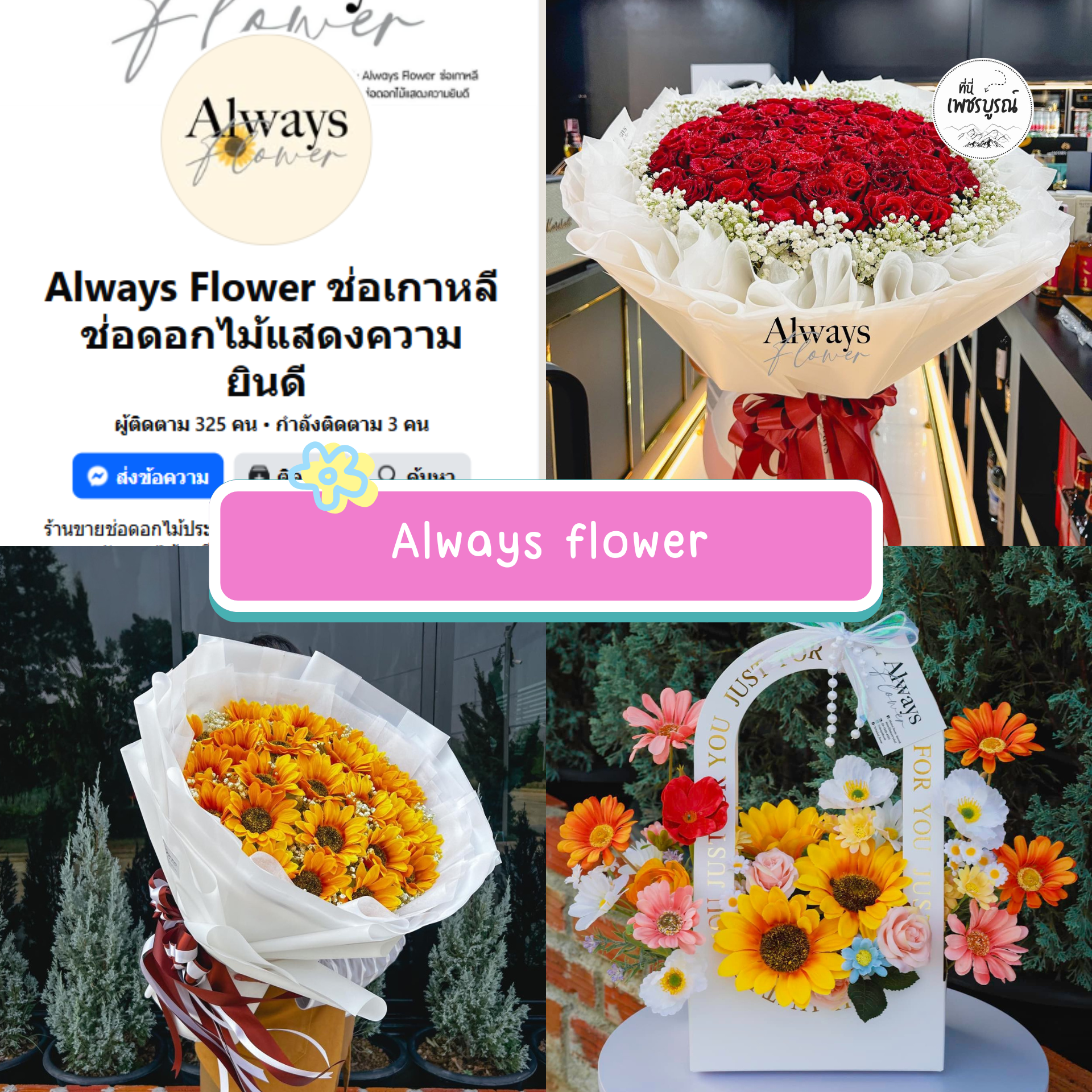 Always Flower ร้านนี้คือที่สุดของสไตล์เกาหลีในเพชรบูรณ์ค่ะ การเลือกใช้กระดาษห่อและริบบิ้นคือมีสไตล์ ดูทันสมัยสุดๆ ไฮไลท์ที่ห้ามพลาดคือ ช่อธนบัตร และ ช่อดอกกุหลาบกลิตเตอร์ ที่ทำออกมาได้สวย ตรงปก ใครอยากให้ของขวัญที่เก็บไว้ได้นาน หรืออยากเปย์เงินสดแบบมีสไตล์ ต้องร้านนี้เลย